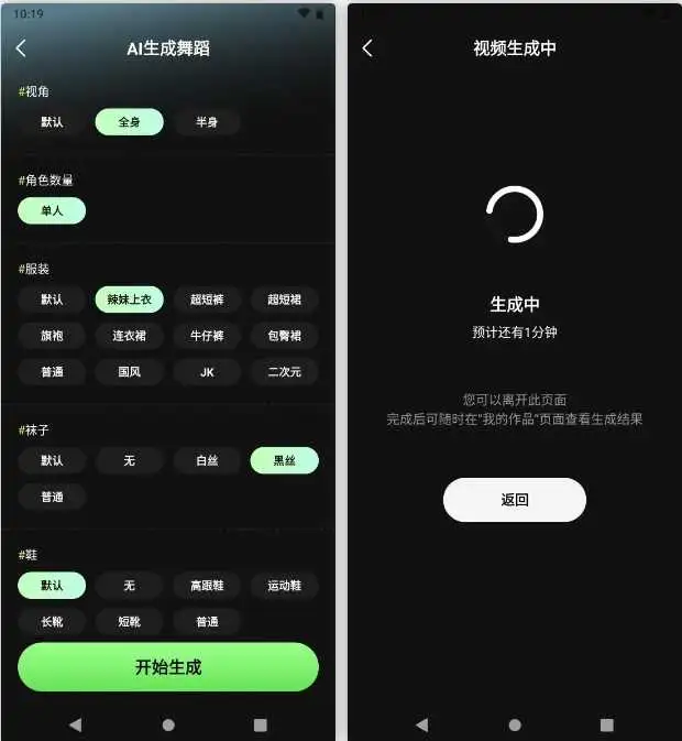 进入舞蹈生成功能后,选择您喜欢的舞蹈风格,稍等几分钟即可生成您的专属舞蹈视频。在等待期间,您可以退出程序,稍后返回查看您的作品。